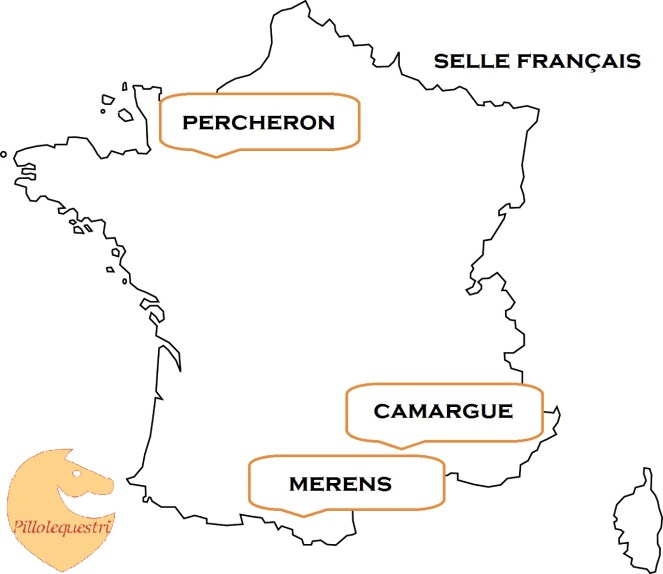 Oggi parleremo dell principali razze equine della Francia e abbiamo scelto di parlarvi del Percheron, del Camargue, del Merens e del Selle Français (Sella francese). Dalla cartina qui in alto, potete vedere quale sia l’area di provenienza di ciascuna razza, tranne il Selle Français che non ha un particolare luogo d’origine. Iniziamo!!!