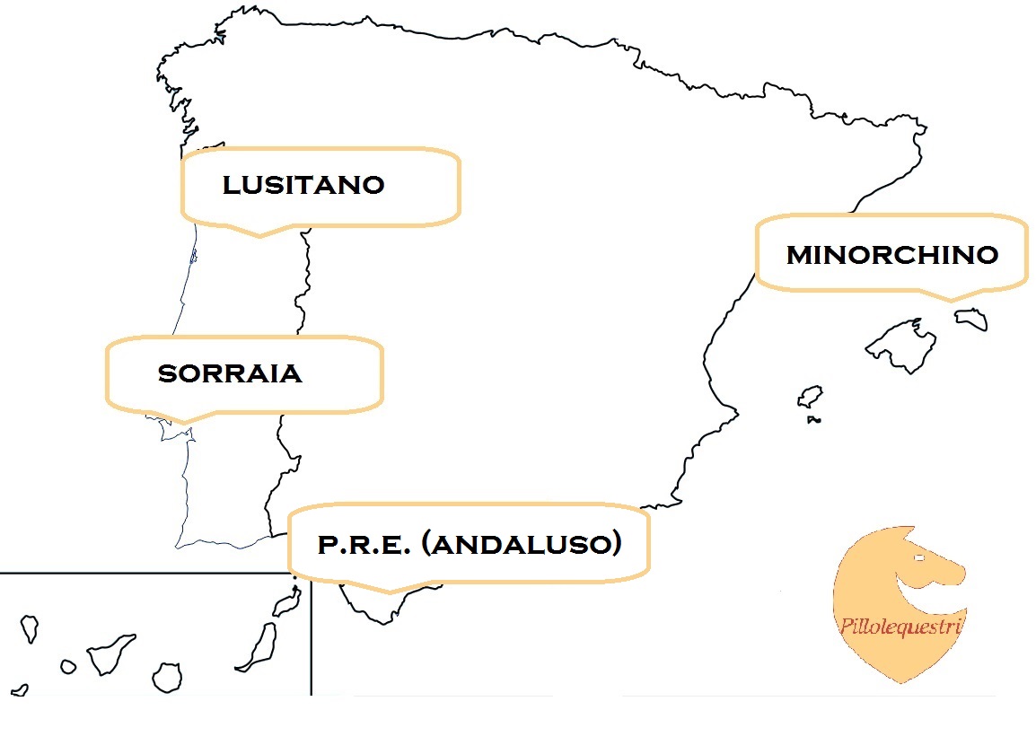 La penisola iberica è senza ombra di dubbio una terra di meravigliosi e nobili cavalli. Insieme scopriremo le caratteristiche principali di 4 bellissime razze che vivono tra Spagna e Portogallo e che sono il Lusitano, il Sorraia, il Pura Raza Española e il Minorchino. Guardate la mappa per scoprire in che zona ognuno di loro ha origine. Iniziamo!!!