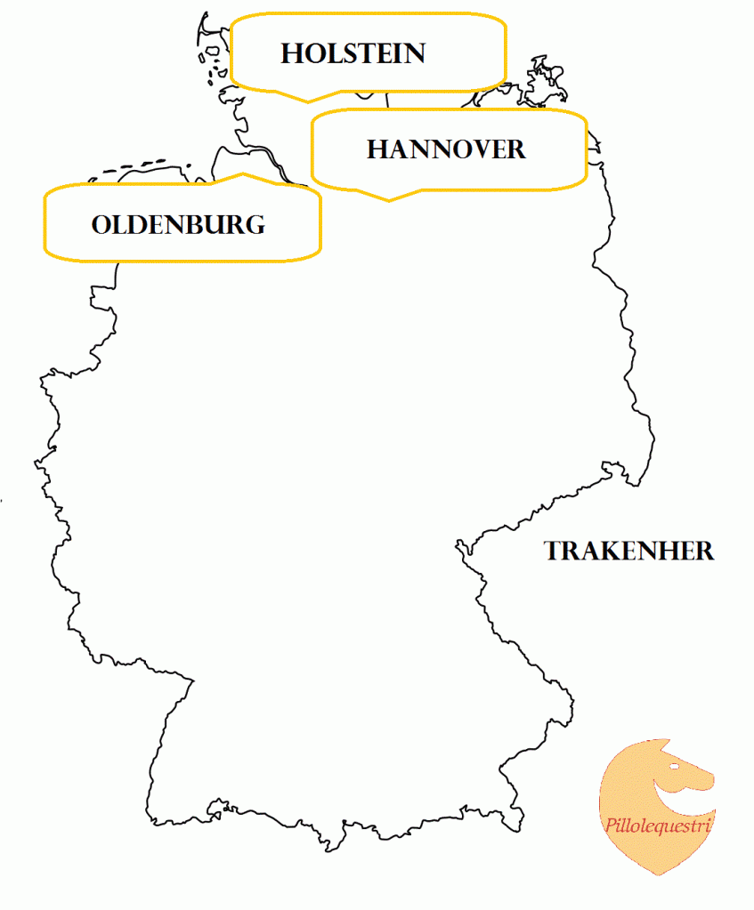 La Germania è la patria di grandi cavalli atleti, frutto di un allevamento rigoroso e attento, mantenutosi tale nei secoli. Insieme scopriremo le caratteristiche principali di 4 famosissime razze che sono l’Holstein, l’Hannover, l’Oldenburg e il Trakenher. Guardate la mappa per scoprire in che zona ognuno di loro ha origine. Iniziamo!!!