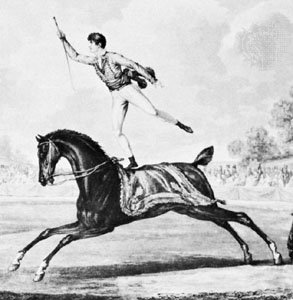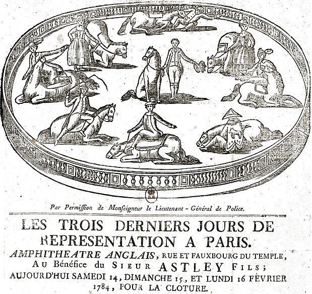 Alle esibizioni dei cavalli, che rappresentavano i più alti livelli di destrezza e virtuosismo equestri, si aggiunsero solo in seguito i numeri di funamboli, giocolieri, acrobati e clown. Gli intrattenimenti circensi ebbero grande fama anche a Parigi, dove Astley aprirà un secondo circo, l’Amphithéâtre Anglais; qui la fama di Astley continuerà sotto il nome di un suo socio, l’italiano Antonio Franconi, cavaliere e circense con cui i numeri di Alta Scuola rimasero una parte fondamentale e popolare del programma.