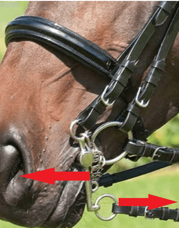 C’è poi la nuca che può essere coinvolta indirettamente nel caso di morsi che utilizzano le leve; quando si tirano le redini, la parte inferiore della leva va indietro, mentre la parte superiore va in avanti; in questo modo la pressione tramite i montanti arriva fino alla nuca, costringendo il cavallo ad abbassare la testa.