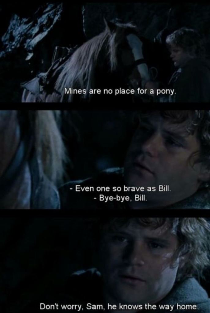 Secondo il racconto di Tolkien, Bill viene comprato da Aragorn a Brea da un losco personaggio che lo maltrattava, e accompagnerà la compagnia per lo più come animale da soma fino al regno degli Elfi. Sam si affeziona particolarmente a Bill, tanto che quando Gandalf gli ordinerà di lasciarlo andare per farlo tornare a casa, per l’hobbit sarà un addio doloroso.