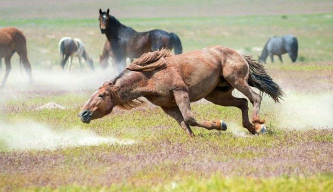Si tratterebbe di un atteggiamento intimidatorio, con il quale il cavallo, spesso lo stallone, afferma il proprio dominio sugli altri membri del branco, le cavalle e i puledri, e li fa muovere nella direzione desiderata.