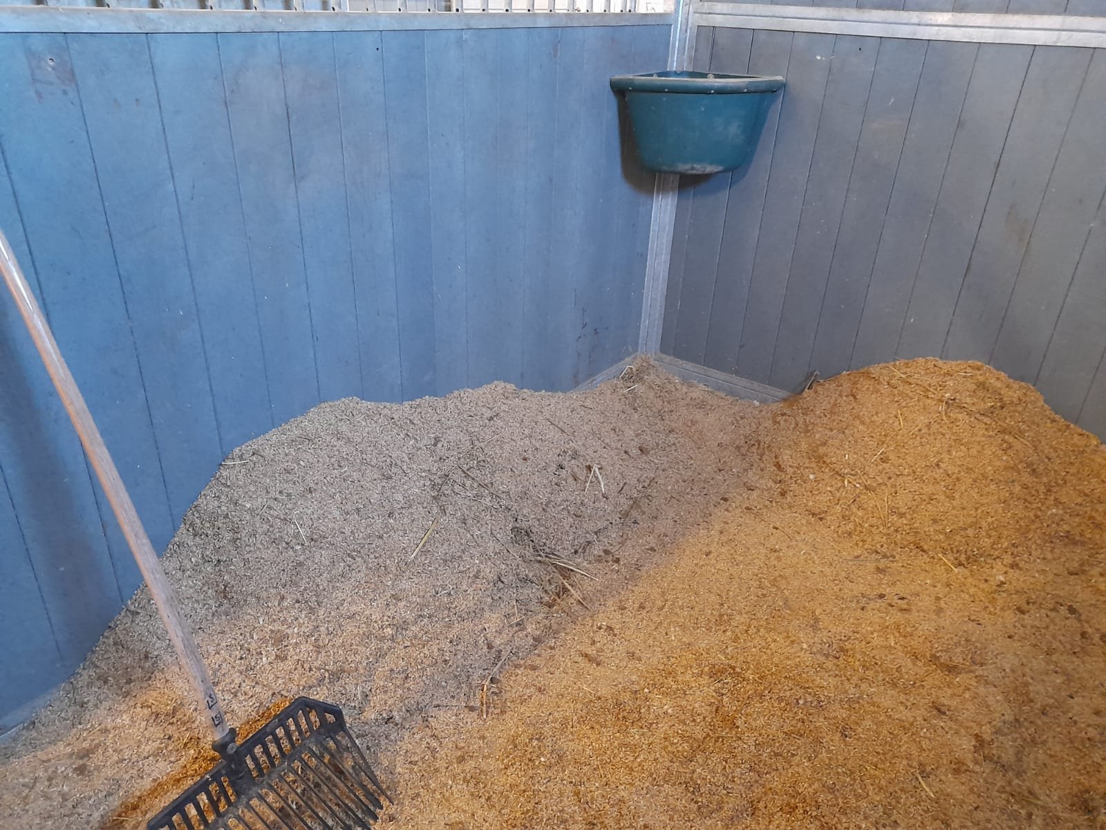 - nel momento in cui il cavallo deve rientrare nel box, la lettiera viene sistemata a formare una zona più voluminosa al centro, perché come già detto è qui che ho bisogno della massima assorbenza (e comfort durante la permanenza del cavallo)