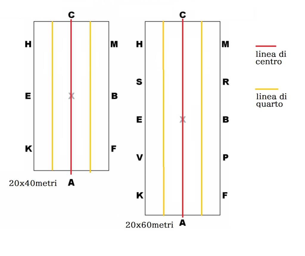 La linea di centro, come dice la parola, divide il campo a metà nel senso della lunghezza, andando da C ad A; la linea di quarto, in realtà linee di quarto perché sono due, divide ulteriormente la metà del campo andando a definire un quarto dello spazio totale. Quest’ultima è importante per l’esecuzione di alcune figure come la serpentina, e di esercizi per la ginnastica del cavallo come la cessione alla gamba.